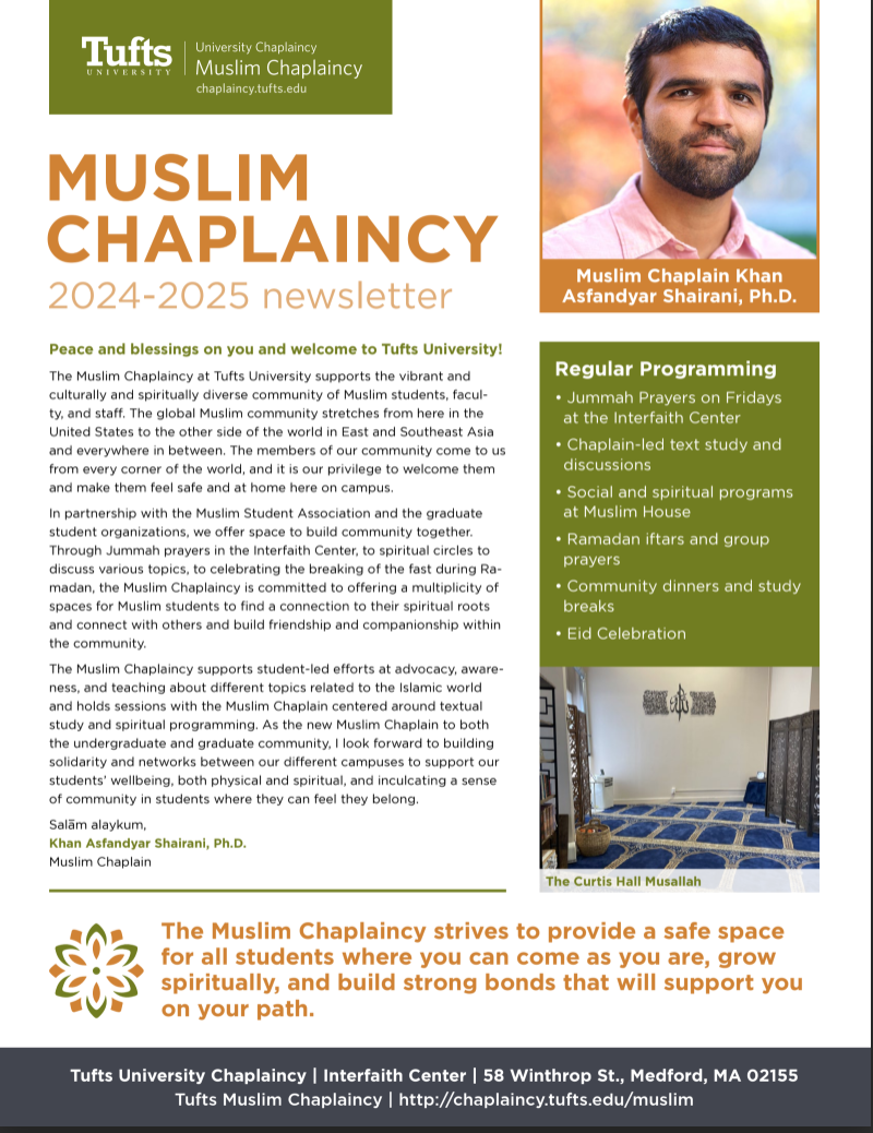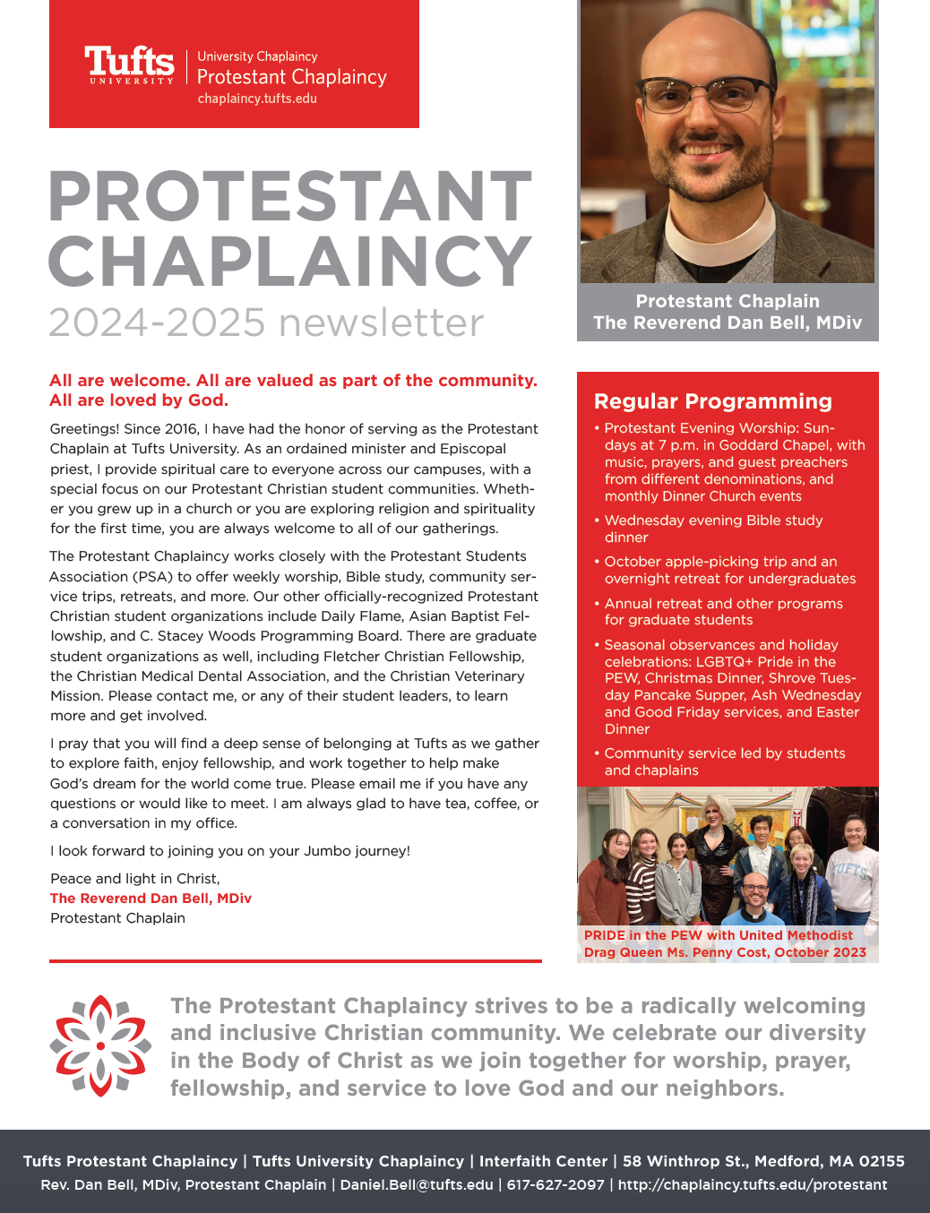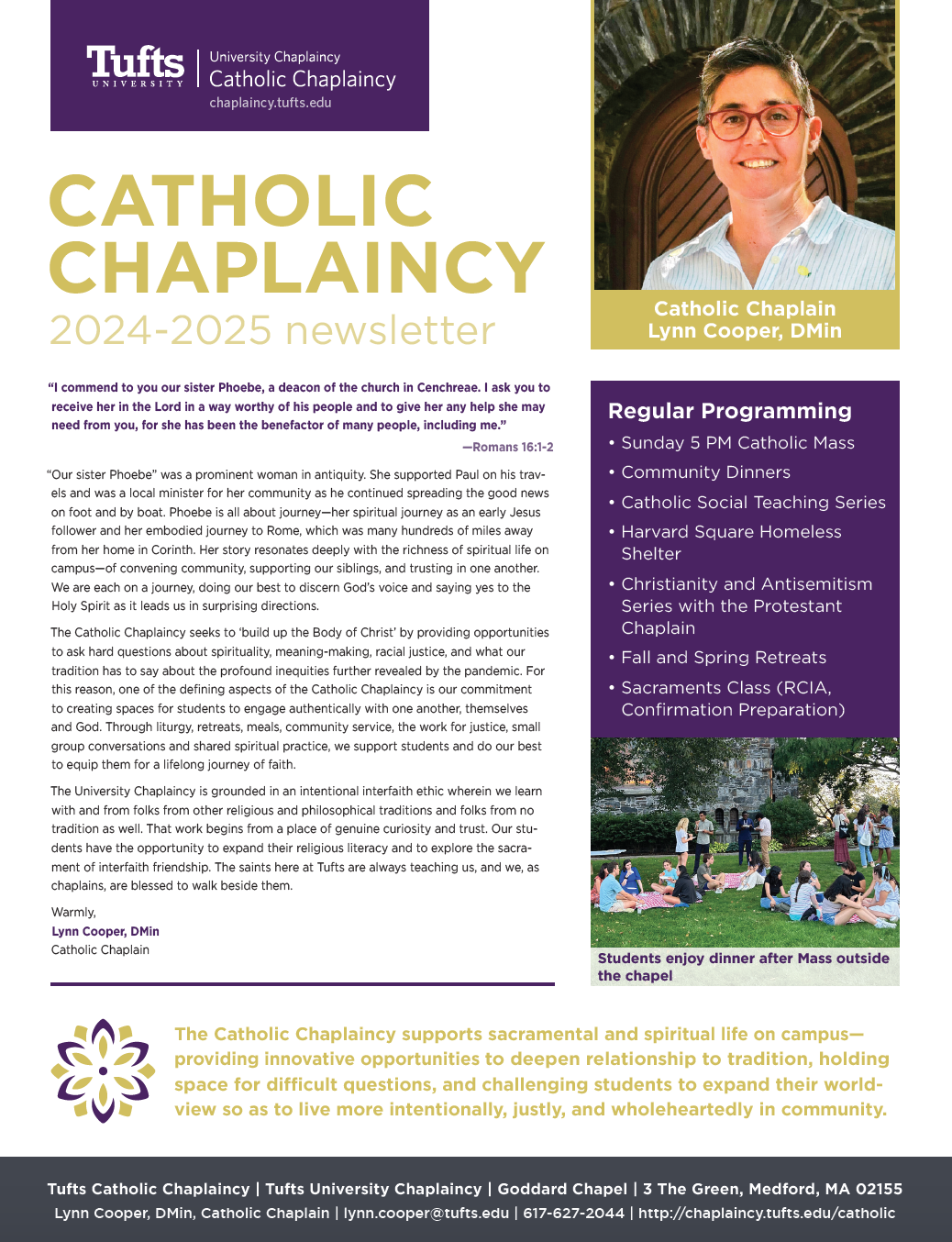Each summer, we publish a newsletter that details the chaplaincy events in the previous academic year, and describe how each of our chaplaincies are serving students, connecting with our local communities, and staying in touch with alums. You can read all past issues on our chaplaincies' websites, including Buddhist, Catholic, Humanist, Hindu, Muslim, and Protestant. You can download the latest versions of the newsletters below. Sign up for our weekly newsletter here.