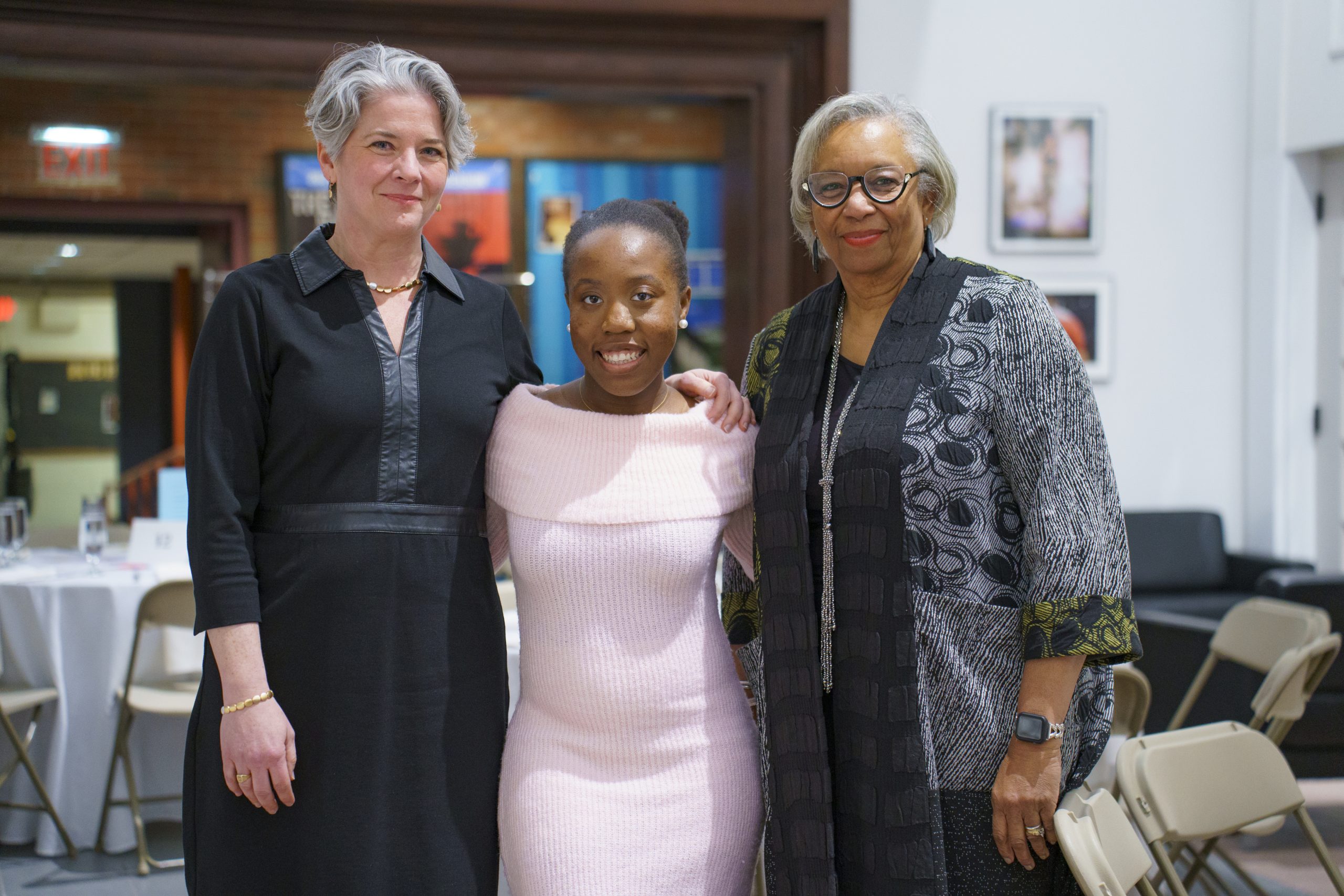 2024 Student Voices awardees (left and right) Alpha Massaquoi and Tatum Schutt with Christian Walkes (center) of the Museum of African American History after the annual Rev. Dr. Martin Luther King, Jr. Celebration.